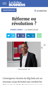Pierre Cannet évoque, dans sa dernière chronique pour Les Echos, l’émergence d’un monde en 2D (digital + data) qui impose aux dirigeants d’entreprise de réformer ou de révolutionner leur organisation interne. 2 menus au choix :